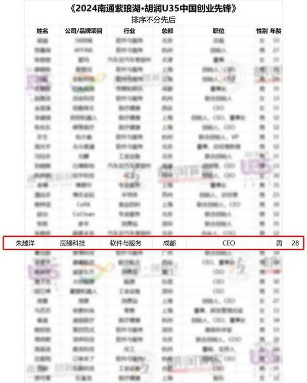 辰鳗科技CEO朱越洋荣登 「2024胡润U35中国创业先锋」软件与服务领域榜单!